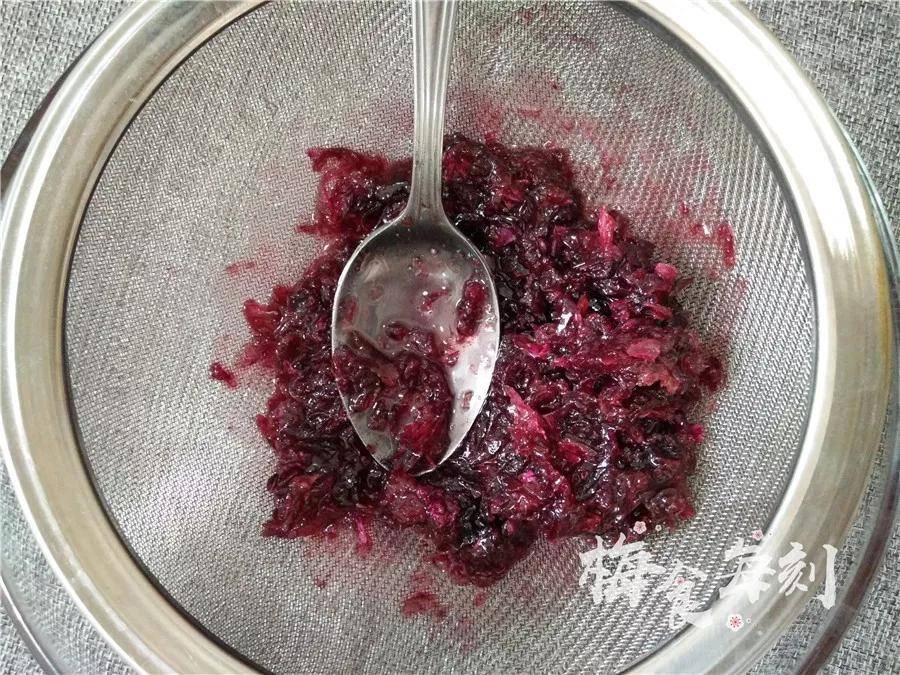 1.玫瑰馅:将玫瑰酱倒入筛子上,用勺子按压,挤出里面的汁液,取200克放入碗中。(如果不挤压,填充物会太湿)