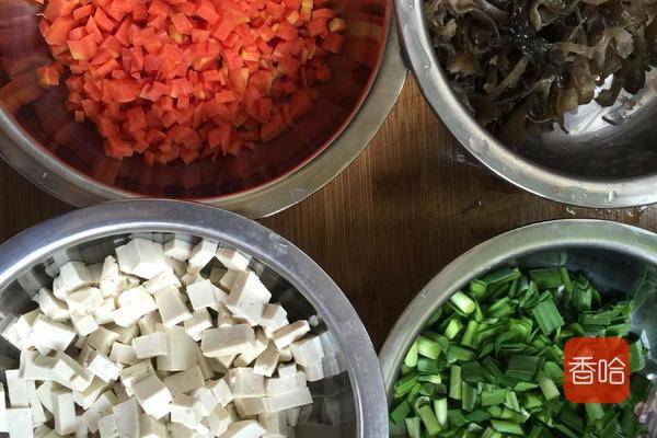 1.将所有原料切成丁,将木耳切丝。