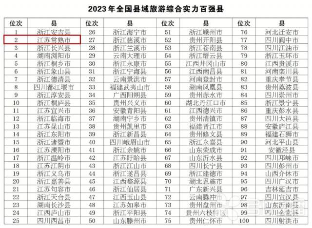日前,全国县域旅游研究课题组、北京华夏佰强旅游咨询中心公布2023年全国县域旅游综合实力百强县,常熟从1866个县(含县级市、自治县、旗、自治旗、特区、林区)中脱颖而出,荣膺全国第二。常熟也是前十强中江苏唯一的上榜城市。