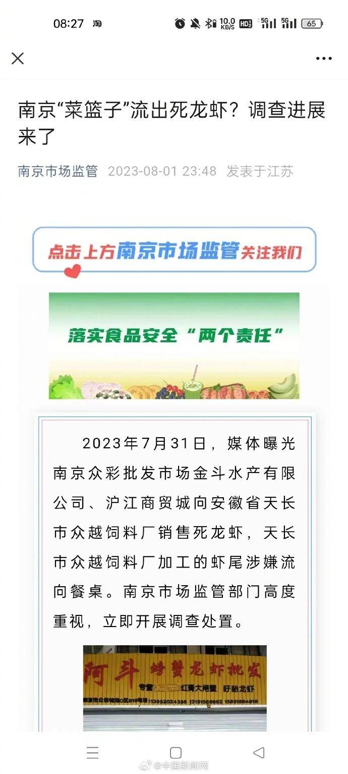 8月1日晚间,南京市场监管局回应称,对此高度重视,立即开展调查处置。经查,自今年5月起南京金斗水产有限公司在南京农副产品物流配送中心收购死龙虾,集中销售给天长市众越饲料厂。执法人员现场查见天长市众越饲料厂的《营业执照》复印件、委托书,以及“将收集的死龙虾作为饲料原料加工使用”的承诺书。