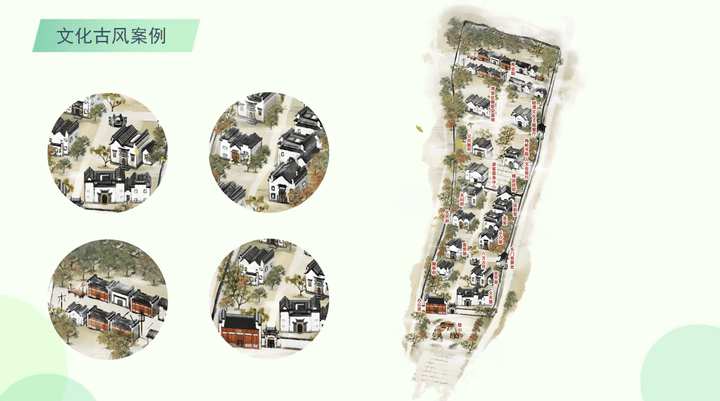 运用毛笔笔刷,水墨和矿物颜料的配色仿制国画独特风格。适合表现小规模古迹村落传统建筑,适合印刷。
