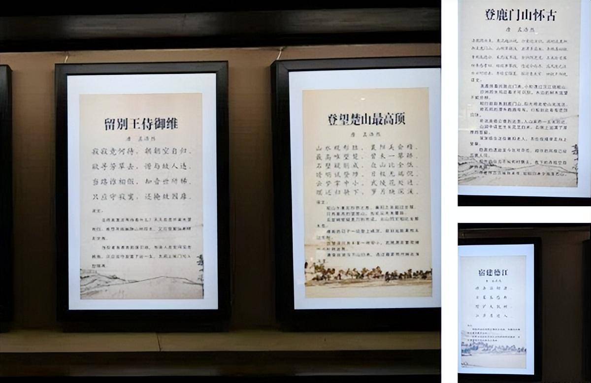 陈列馆里,落落白壁上有画,综述孟浩然坎坷波澜一生,计有“耕读世家,书剑兼修”、“漫游求仕,名扬天下”、“科举不第,纵情山水”、“供职幕府,终老南园”四章节。