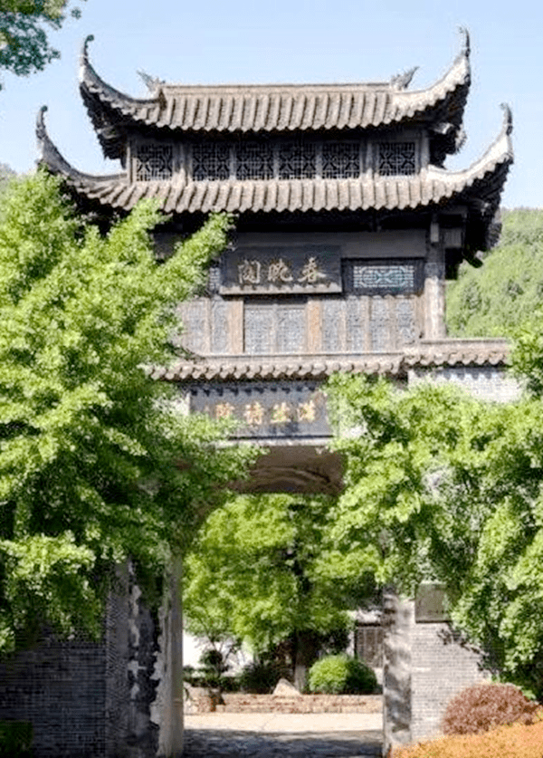 春晓阁位于浩然诗院入口处,取名自孟浩然诗《春晓》,牌匾书法集字于宋代书法家米芾书帖。登上春晓阁既可在上面吟诗品茗,还可一览孟园的全景。