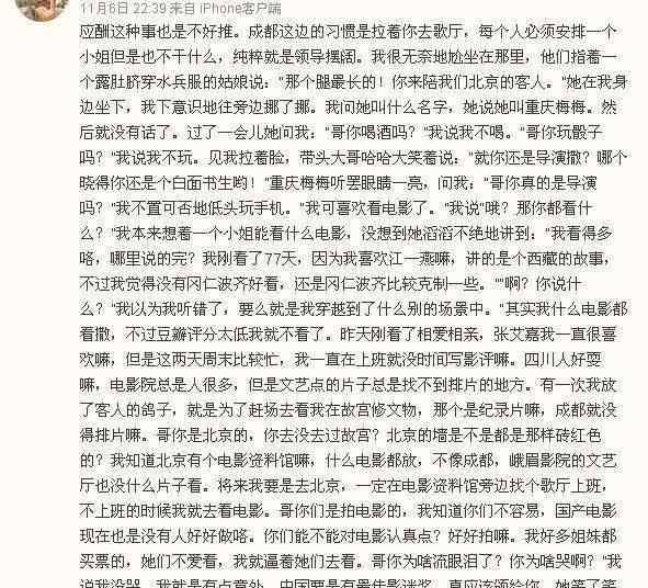 但我耐着性子看完这个长微博,第一感觉却是:这个所谓的陪酒女影迷,怎么看怎么觉得是三分真实七分编造,段子手指数,直指那年曾经引发全民上海大寻踪的那个“神马都是浮云”的小月月