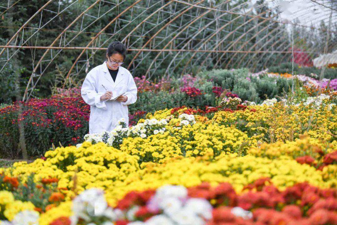 冬季,技术科研人员在大棚内观察室外美化用花的长势情况。