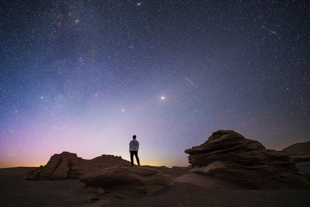 在新疆哈密巴里坤怪石山,一名摄影爱好者在拍摄银河。CICPHOTO/刘兵 摄