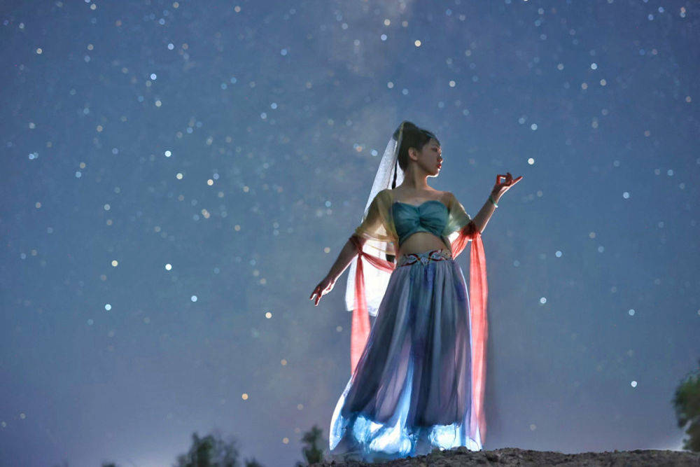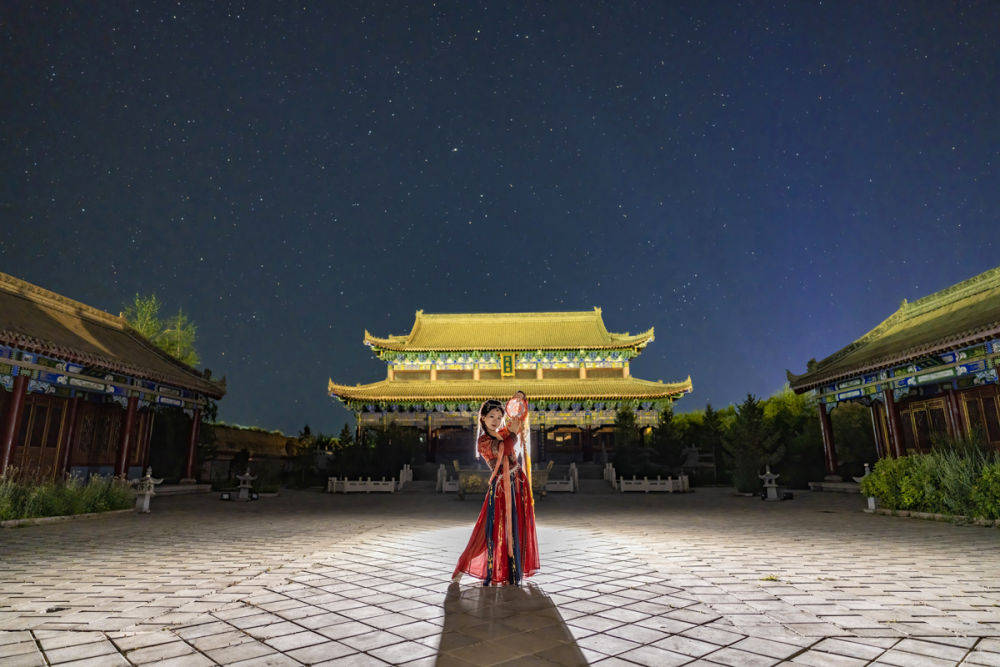 游客在新疆哈密巴里坤古城的星空下留影。CICPHOTO/周博 摄
