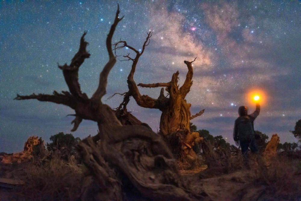 游客在新疆哈密伊吾胡杨林与银河合影。CICPHOTO/刘兵 摄