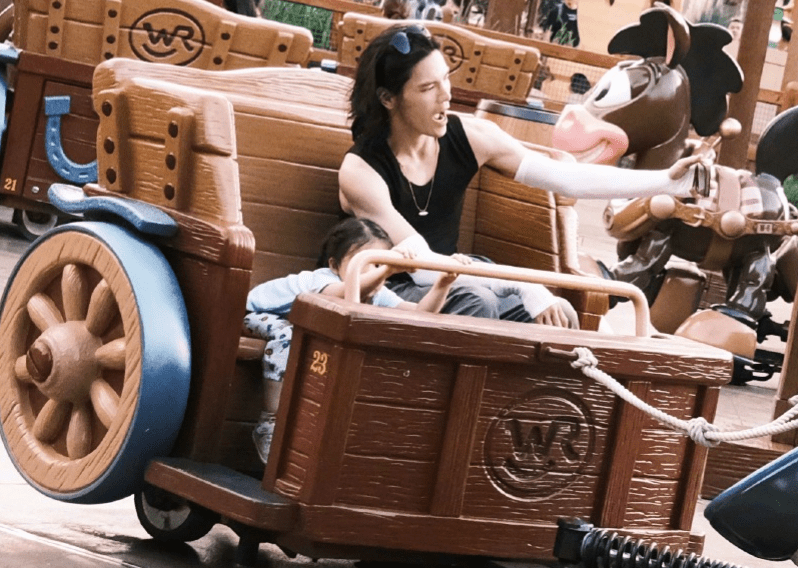 向佐给女儿在迪士尼举高高,从背景不难看出游客真的很多。