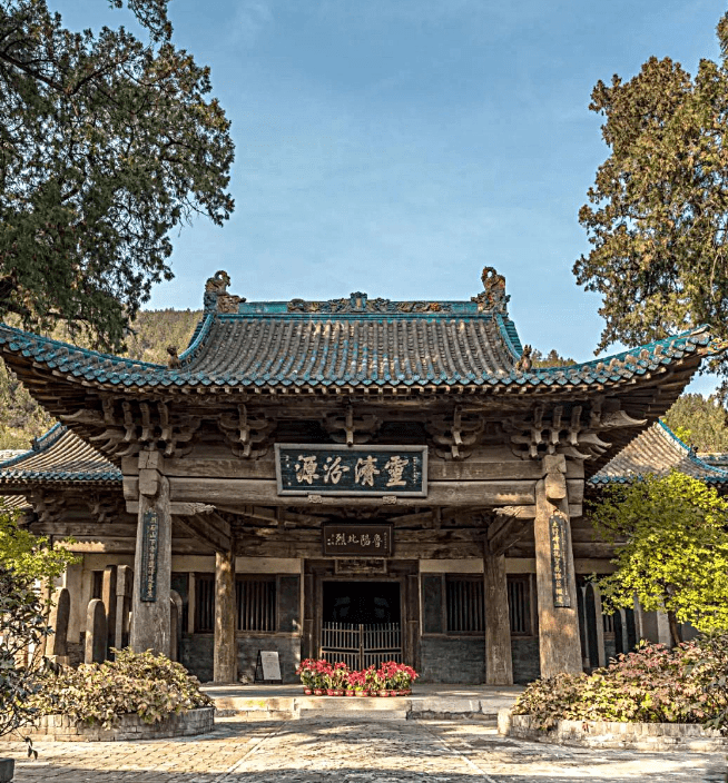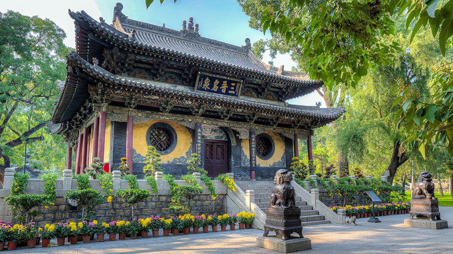 太山,位于太原市西南23公里风峪沟北,四周丛林遍野,古柏掩映,寺隐其间,非登临不易得见。太山之名,始见于南朝沈约所著的《宋书·卷四十六·列传第六》中所载“王懿,字仲德,太原祁人……积年,仲德欲南归,乃奔太山……”相传,北汉时有山民“石敢当”以勇敢闻名于世,就连他居住的山也跟着出了名,太山之名便取之“太(泰)山石敢当”的谐音。还有一种说法是,因远看山峰呈“太”字而得名。