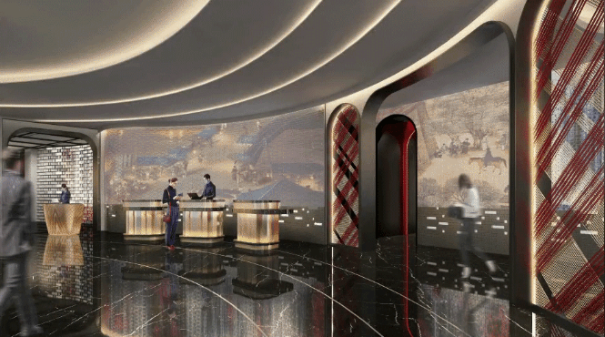 从步入酒店大门开始,大堂前台的巨大屏幕至显震撼,它是可以呈现高分辨率图像的水晶玻璃砖墙,再以AI技术将著名的《清明上河图》等传统艺术作品实现生动的动态效果,顾客在光临酒店空间的第一时间,便足以建立对酒店文化属性的立体感知。