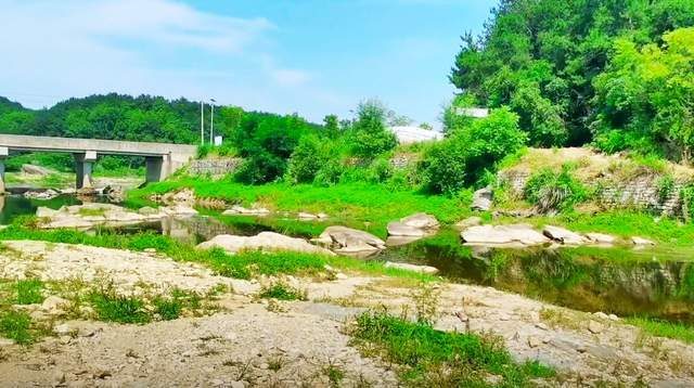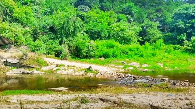 来到双河村,首先会被这边的环境所吸引,毕竟是纯粹的山林,那种幽深的境况与城市完全不同。走唯一一条乡道进村口,溯溪的小河近在眼前,虽然远离城市,但乡道的基建设施比想象的要好很多。比如,乡道的路面铺了水泥,刷上路标,两旁的行道树和电线杆分布均匀,近处的树林远处的山丘,突兀郁深,看着在眼前,实际路途遥远。从乡道的一座桥梁下去,路面下降,开始与旁边的河流持平,两旁的河滩范围变宽,砂石聚集、小草丛生,十分和谐。