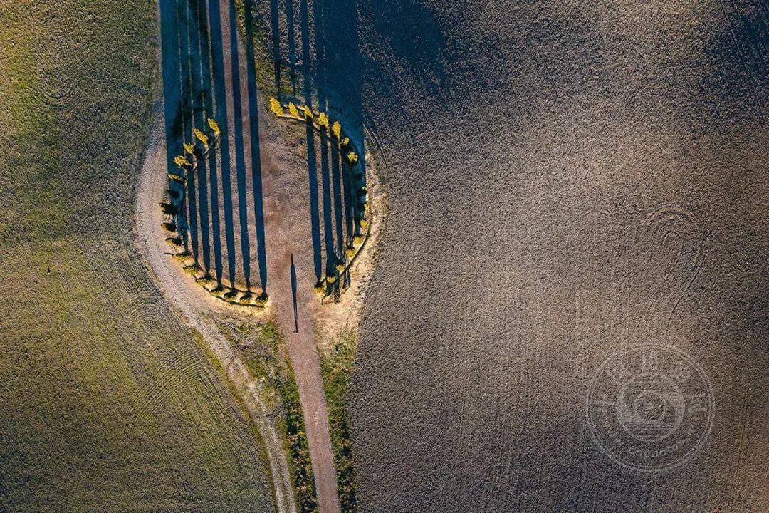 这是一个简单而强烈、精致的图像。我们喜欢它干净的图形,但又有迷人的细节,比如柏树林右侧的犁产生的“问号”。