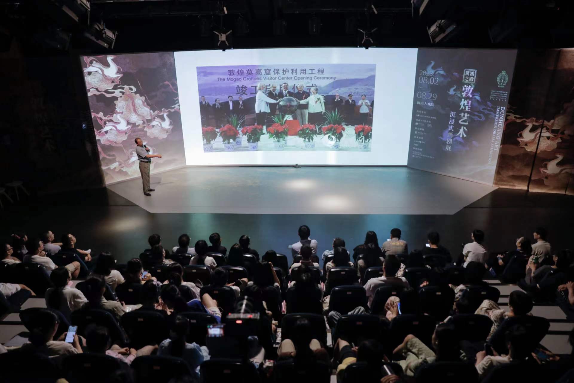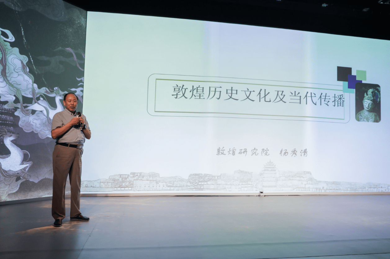 敦煌研究院研究员/中国敦煌石窟保护研究基金会理事长杨秀清、天津美术学院教授/硕士生导师王伟毅、厦门大学历史与文化遗产学院副院长李莉等相关专家学者、厦门市旅游集团董事长黄轶达、副总经理林鹭鸣以及厦门闽南大戏院管理有限公司副总经理李媛出席了当天的开幕式。展览主创团队天津美术学院副教授/硕士生导师蒋旎、天津美术学院党委学工部德育教研室负责人杨春扬、天津美术学院移动媒体艺术系张欣老师与王伟毅馆长以及厦门大学历史与文化遗产学院助理教授周杨展开座谈,共同探讨敦煌历史文化在新时代背景下的发展与传承。杨秀清理事长还特别就“敦煌历史文化及当代传播”与观众展开分享。