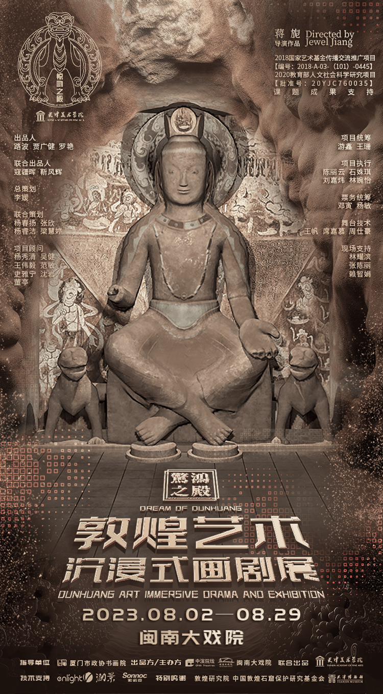 艺术创新是生命力,因而剧场未来艺术跨界的融合与发展尤为重要。2023年8月2日,闽南大戏院携手天津美术学院,在敦煌研究院、中国敦煌石窟保护研究基金会以及天津博物馆的大力支持下,合力打造的“惊鸿之殿·敦煌艺术沉浸式画剧展”隆重启幕,在厦门开启一场以“艺术科技”助力“非遗传播”的文化盛宴。