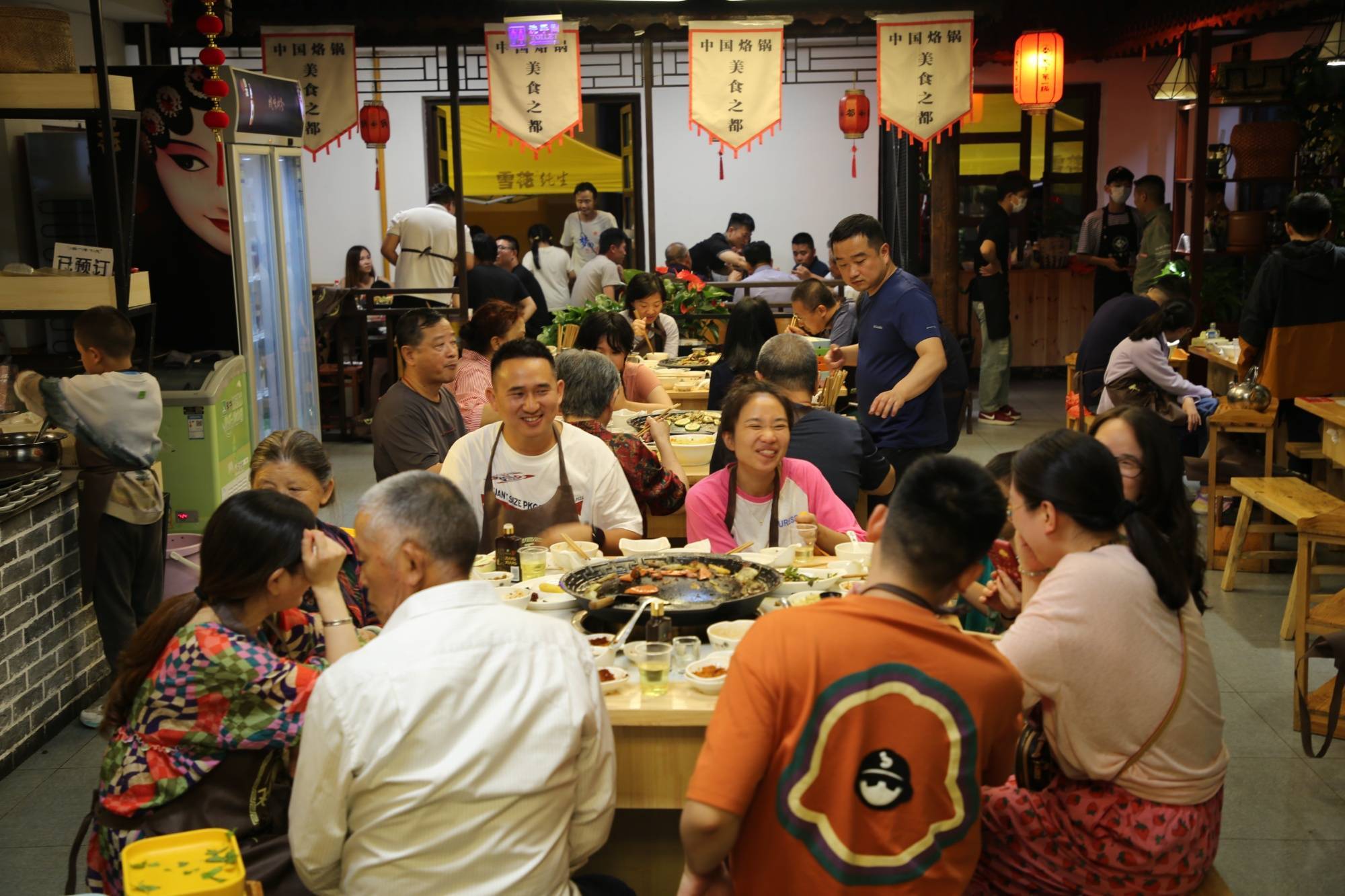 游客在六盘水市水城古镇“天下第一锅”饮食城品尝水城烙锅(赵桦 摄)