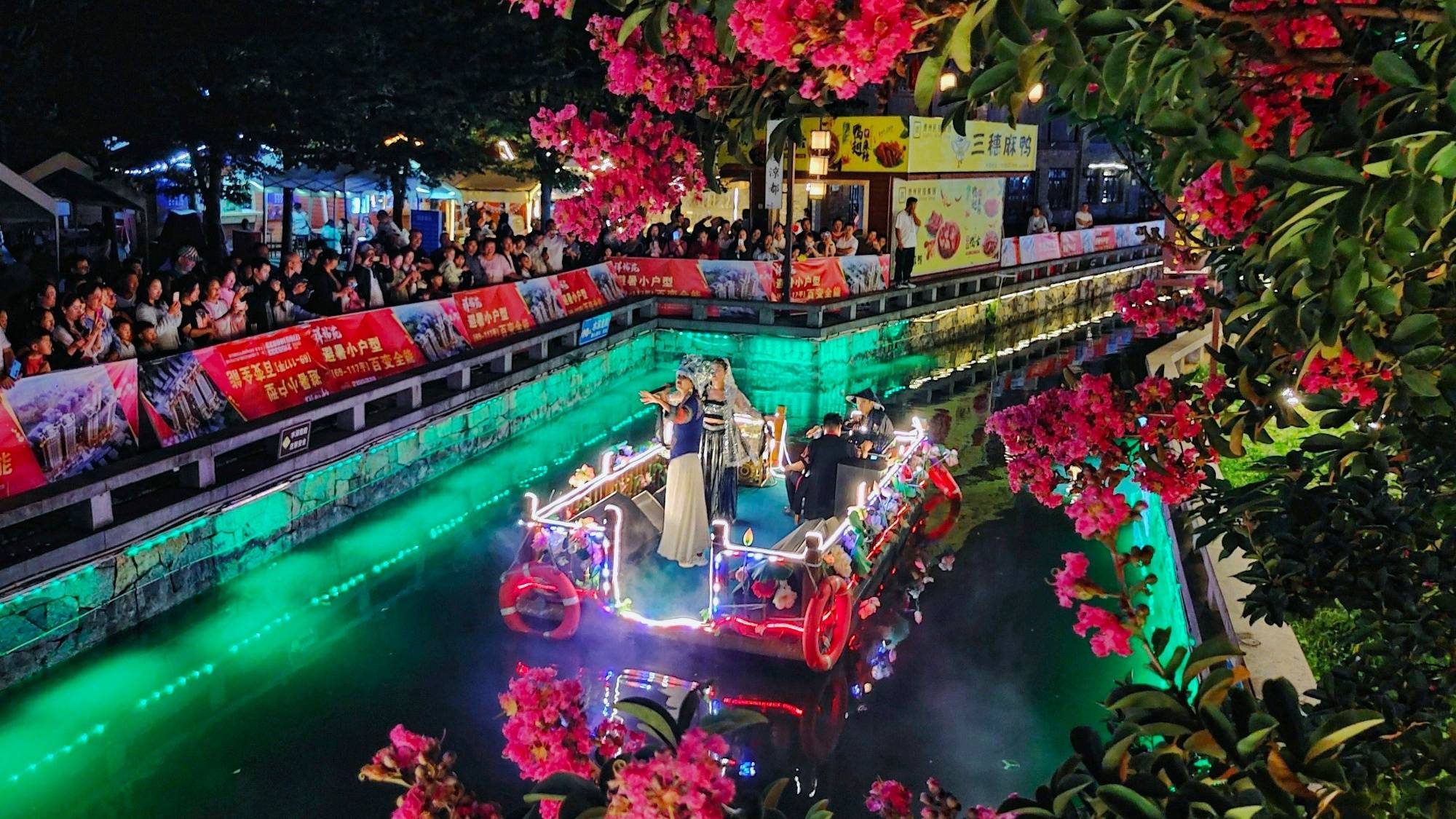 游客在六盘水市水城古镇观看文艺演出(赵桦 摄)