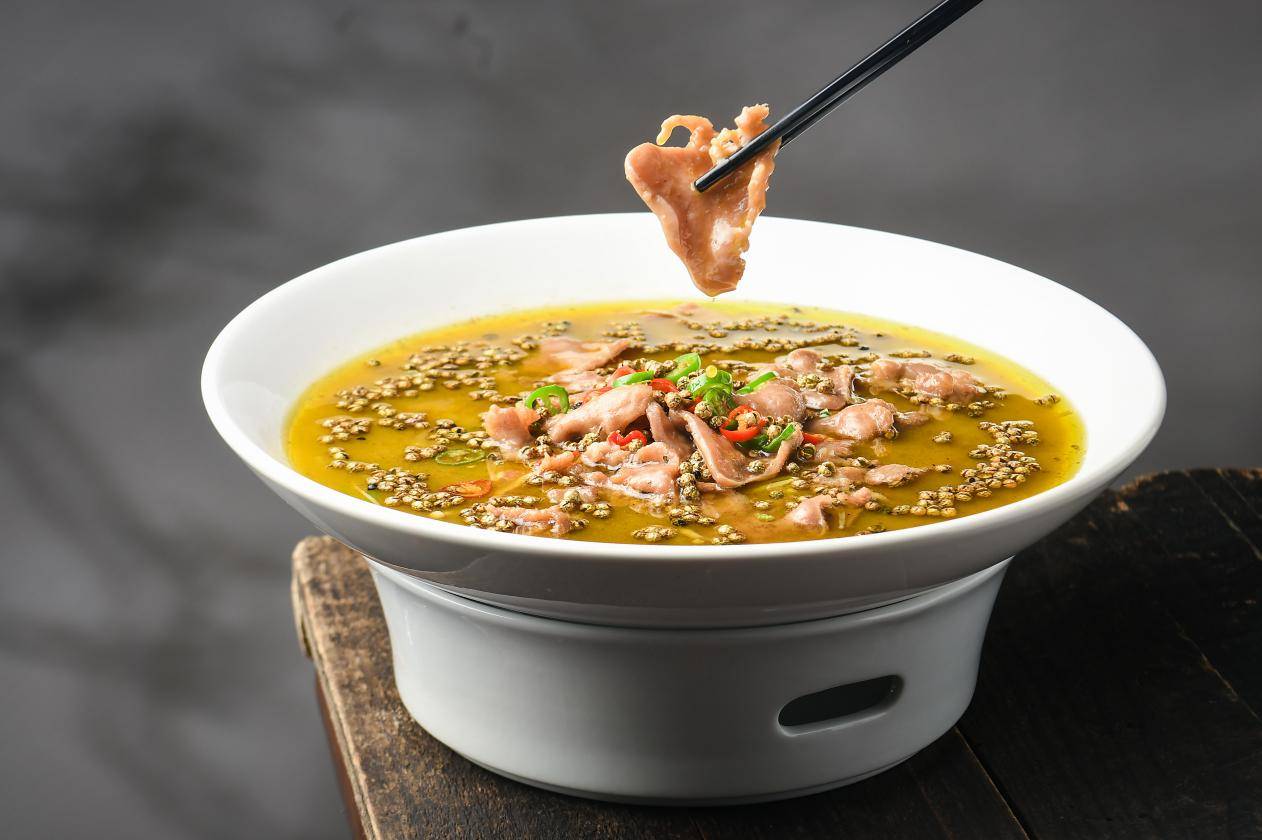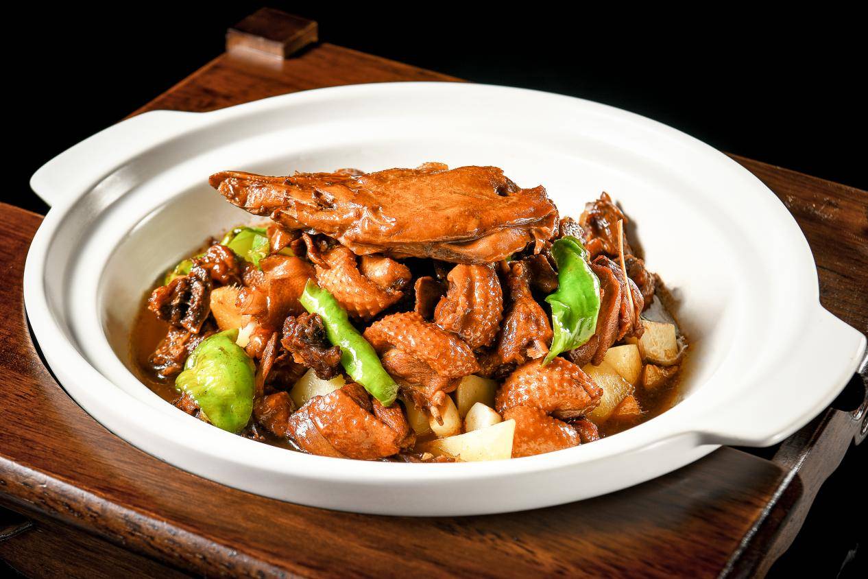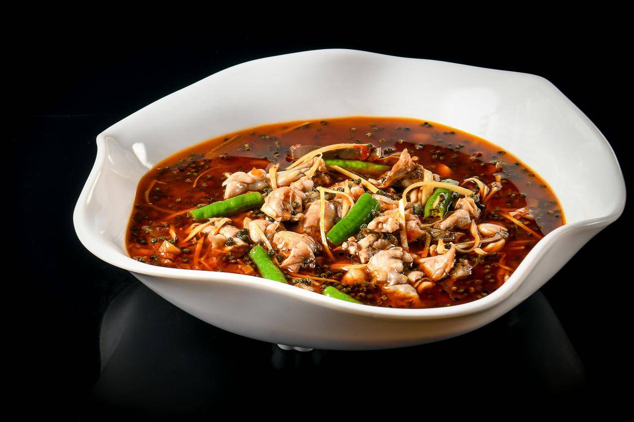 鸡毛店这道仔姜花椒蛙选用自贡当地的仔姜和汉源花椒,口味纯正,香气袭人,经典的盐帮菜,集味厚、味重、味丰于一体,掀开表面的花椒和仔姜,白嫩的蛙肉浮现眼前,夹一筷入口,一丝丝绵软与嚼劲反复刺激着味蕾。