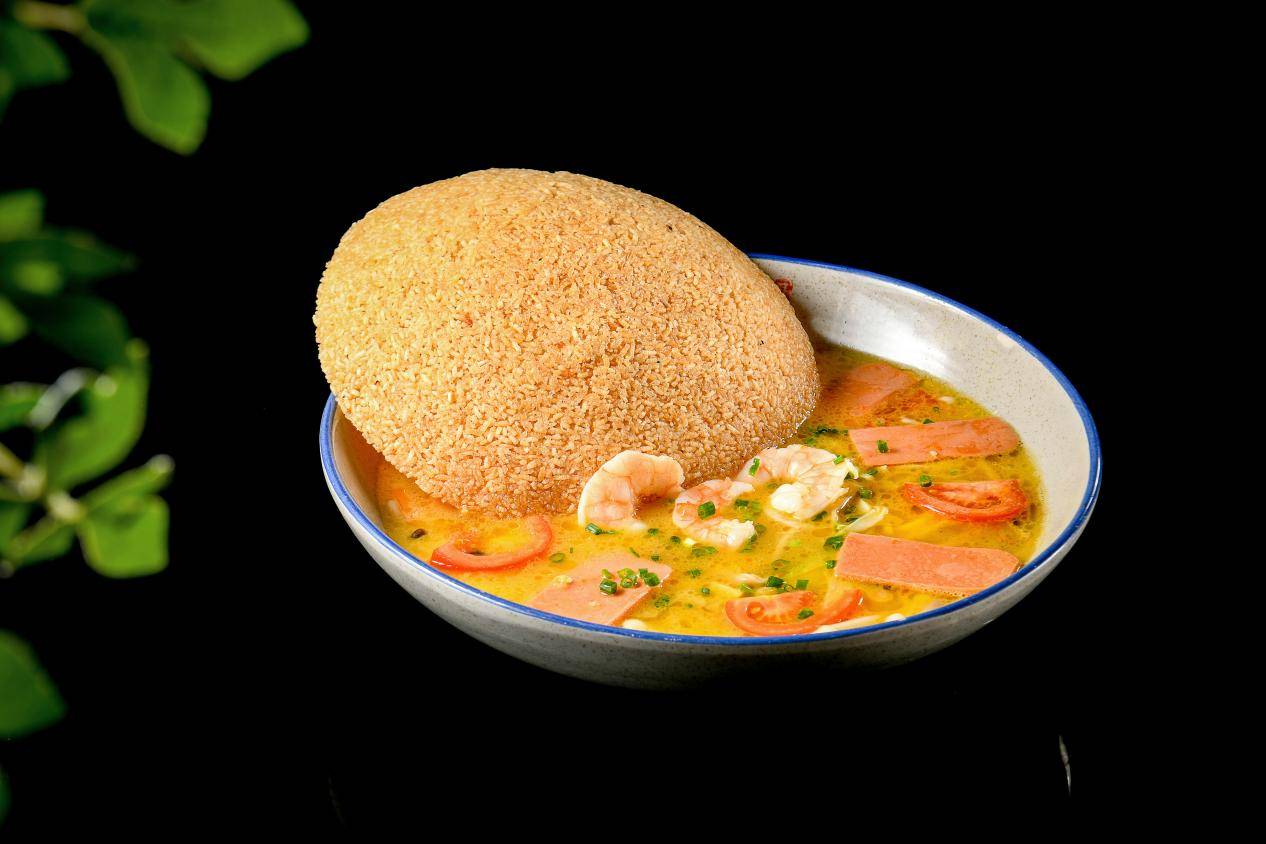 相传在抗战时期后一餐馆有一道菜名为“轰炸东京”,服务员一手端着一大碗油炸锅巴,一手端着一小碗烩虾仁,锅巴放在桌上之后,立即把烩虾仁浇上去,刺啦一声响,食客大悦,认为这一声响仿佛就是东京被轰炸了,心里一高兴,食欲顿开。有红鸡毛店这道虾仁豆汤锅巴有异曲同工之妙,将锅巴炸至金黄,酥脆可口,要是蘸上浓汤,口感又别具一番风味。
