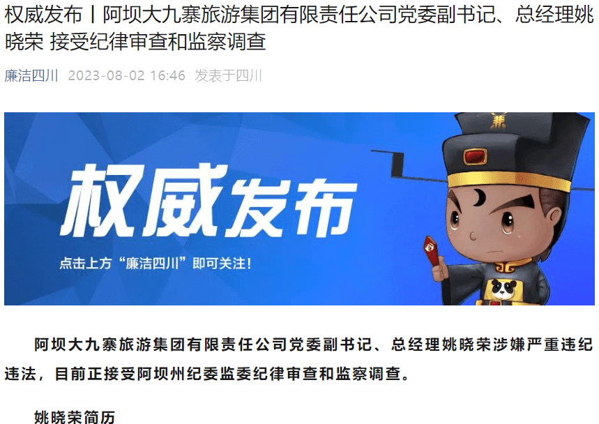 8月2日,据廉洁四川:阿坝大九寨旅游集团有限责任公司党委副书记、总经理姚晓荣涉嫌严重违纪违法,目前正接受阿坝州纪委监委纪律审查和监察调查。