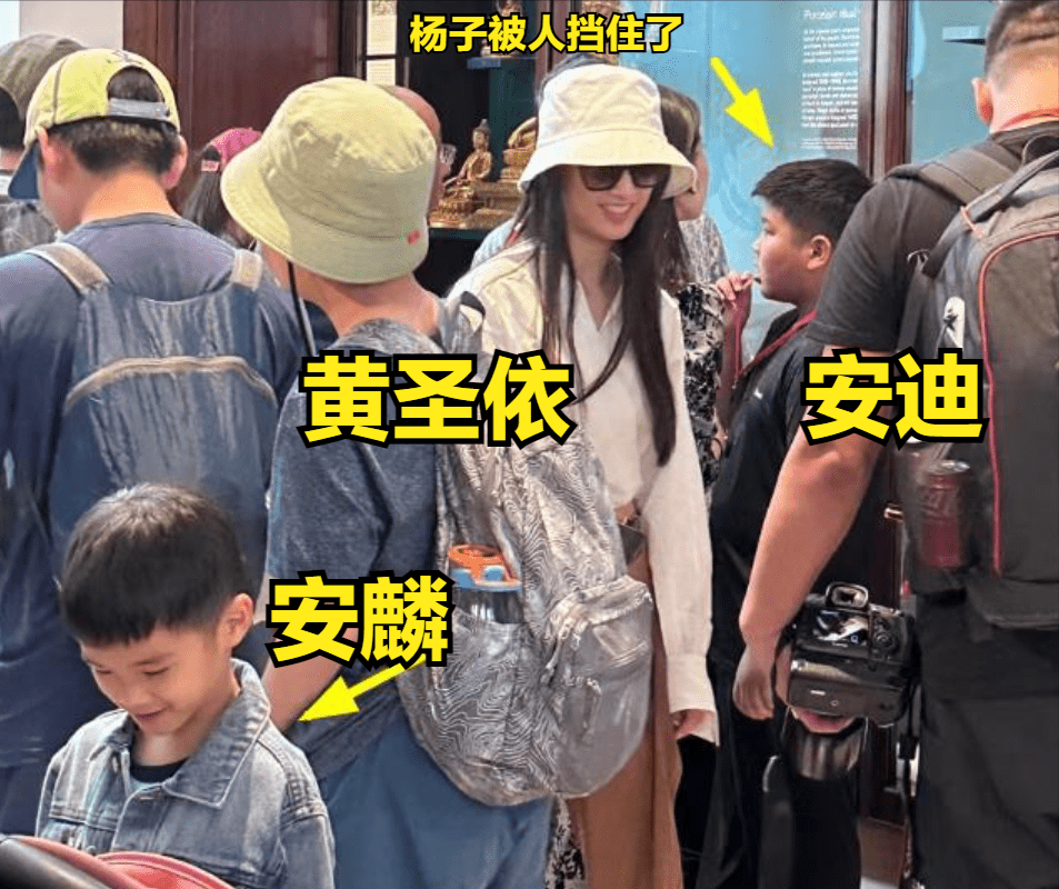 一家四口听着导游讲解,到处参观。因为人比较多,黄圣依一直紧跟在小儿子安麟身边,母子俩的笑容都很灿烂。而大儿子安迪则是跟爸爸杨子在另一旁参观,一家人都很专注。