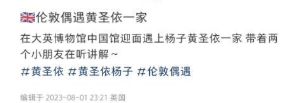 8月1日,又有一对明星夫妻被拍到出国度假,他们就是杨子黄圣依夫妇,带着两个儿子在英国伦敦的博物馆旅游,被网友偶遇夫妻俩还大方的接受了合影,引来网友围观。