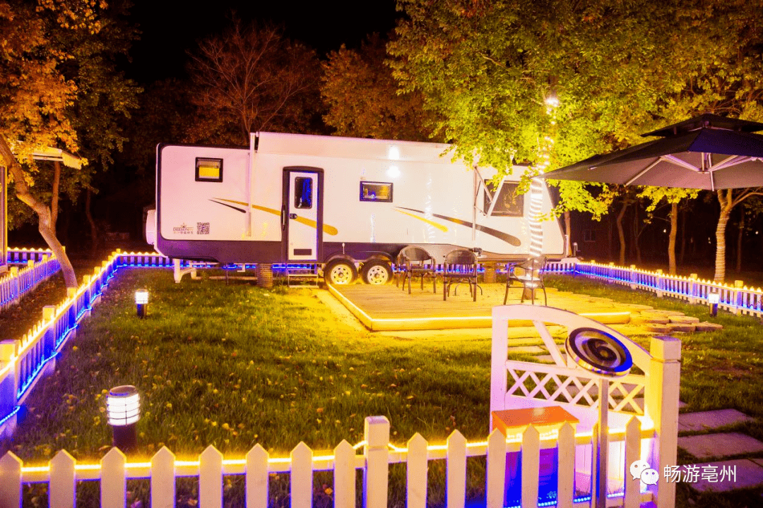 房车露营基地共有11辆房车、5个木屋、3个火车酒店标间,均配备有独立小院,美食、畅聊、趣玩,时尚元素汇集。每到夜晚,流光溢彩的灯光撑起了整个露营地的氛围感,搭配上啤酒、烧烤、地锅炖,美景与美食的碰撞妙不可言。