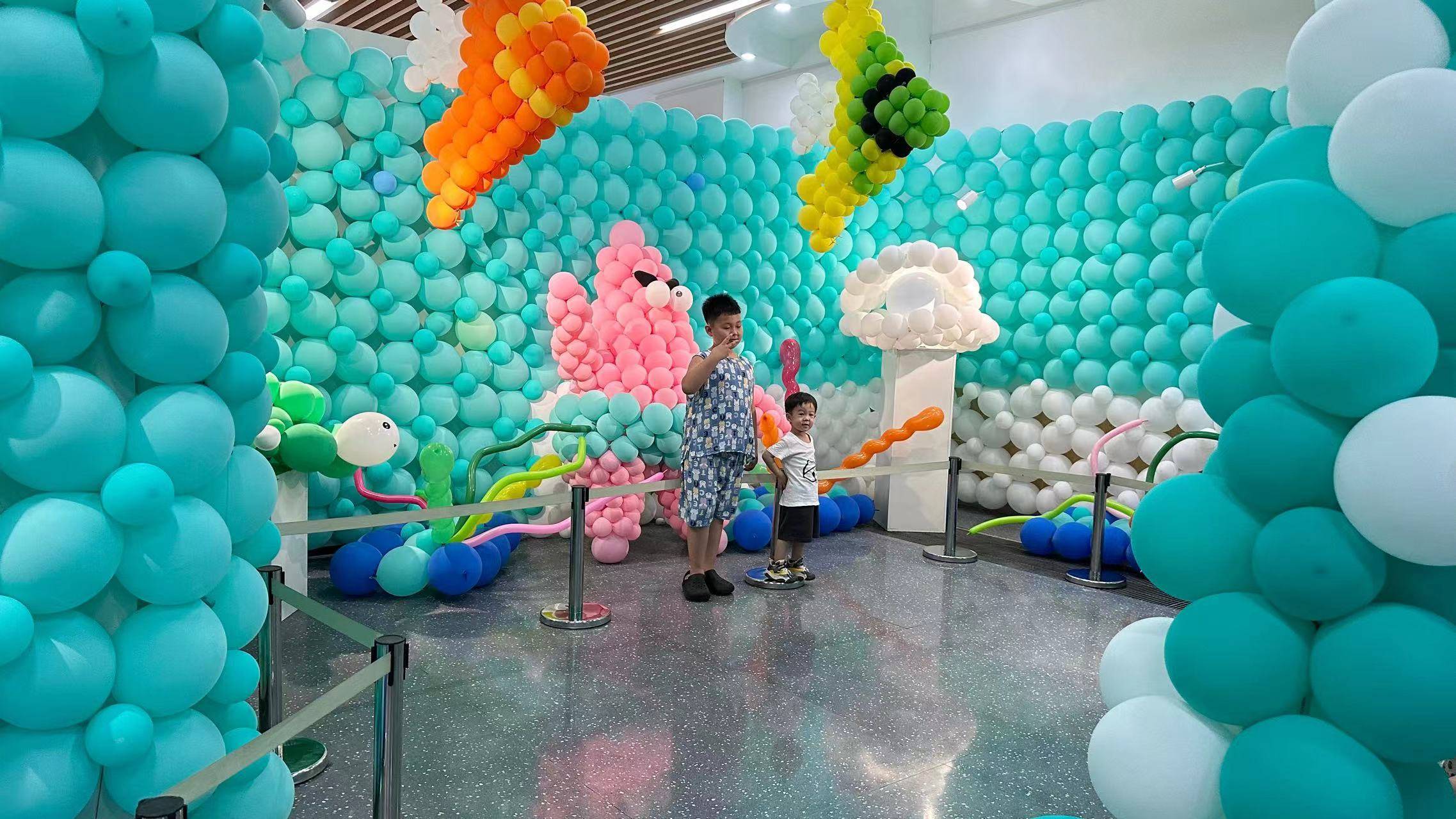 派大星、海绵宝宝、大章鱼、海马、鲸鱼、大象、老虎、长颈鹿、孔雀、太空人、航天飞机、飞碟、星球……走进展馆,动植物气球造型别具匠心萌动可爱,不少游客忍不住拿起手机拍照打卡,乐享亲子时光。