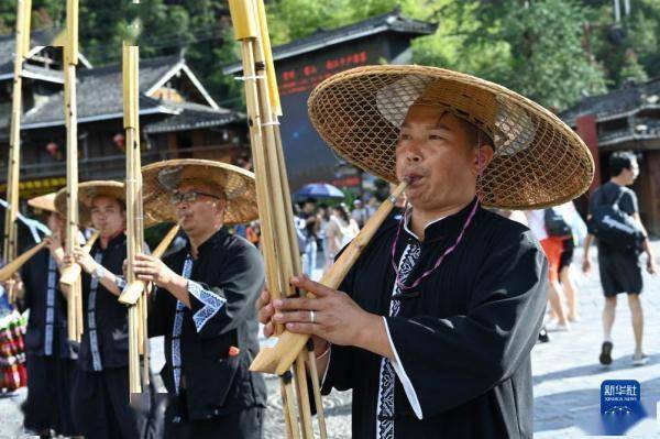8月1日,苗族群众在贵州省黔东南苗族侗族自治州雷山县西江千户苗寨景区吹奏芦笙迎客。
