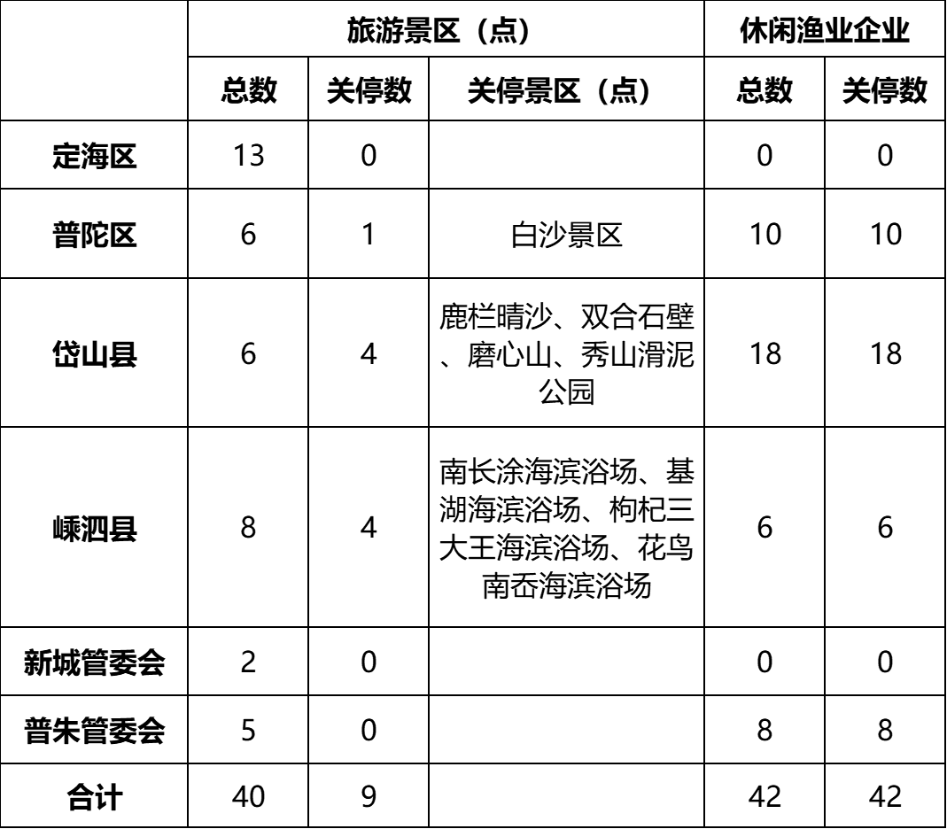根据台风响应,旅游景区(点)、休闲渔业企业关停及滞留游客情况如下:
