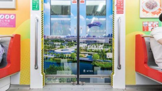 据了解,该趟专列共有6节,每节车厢以蓝、绿、黄三色为主色调,以充满科技感的方式打造了“沉浸式”的临平体验。围绕“江南佳丽地 临平品质城”“迎亚运盛会 品临平韵味”“精彩亚运年 运河临平风”等主题,专列内的图文从城市建设、民生品质、文化底蕴等不同方面全方位展示了临平区风貌。以门贴为例,上面不仅印有“十里梅花香雪海”的超山风景区、风景如画的东湖公园、巍峨挺立的东来阁等风景胜地,也有临平高楼林立的现代化城市景致,让市民和游客在搭乘地铁的同时,对临平区这方产城融合的宜居宜业之地有更深的了解。