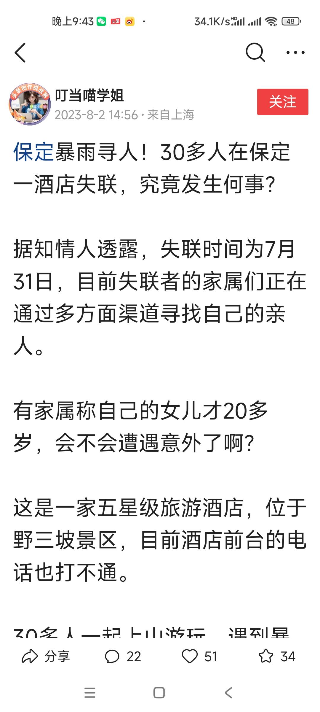 今天,网络上有关保定野三坡景区万鑫酒店多名人员失踪的消息牵动着无数国人的心,所有人都在默默祈祷,希望这些失踪者都能够化险为夷,平安归来。