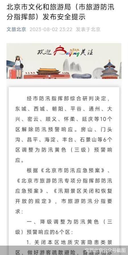 北京市文化和旅游局(市旅游防汛分指挥部)方面表示,下一步,市防汛指挥部针对各区防汛预警响应等级有动态调整的,市旅游防汛分指将及时发布相应文旅行业防汛调整措施。