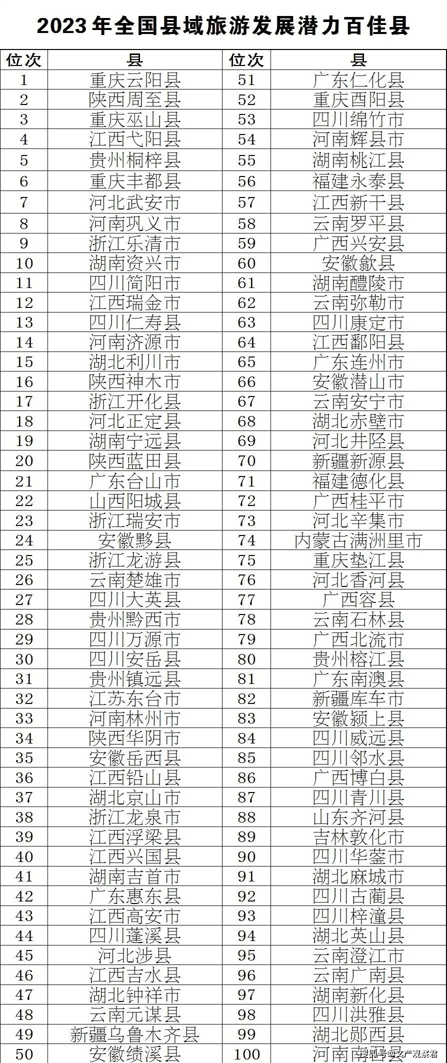 2023年全国县域旅游发展潜力百佳县分布在21个省份。具体分布为:四川15席,江西9席,云南8席,湖北7席,安徽、河北、湖南均占6席,广东、广西、河南、浙江、重庆各5席,贵州、陕西各4席,新疆3席,福建2席,吉林、江苏、内蒙古、山东、山西各1席。