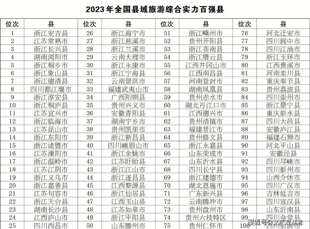 《全国县域旅游高质量发展研究报告2023》显示,2023年全国县域旅游综合实力百强县分布在18个省份。具体分布为:浙江32席,四川14席,贵州10席,江苏8席,江西7席,湖南和山东均占4席,安徽、福建和云南均占3席,河北、河南、湖北和重庆各占2席,广东、广西、吉林和山西均为1席。前十强中,浙江表现突出,占7席,浙江湖州安吉县连续5年位居全国县域旅游综合实力百强县榜首。