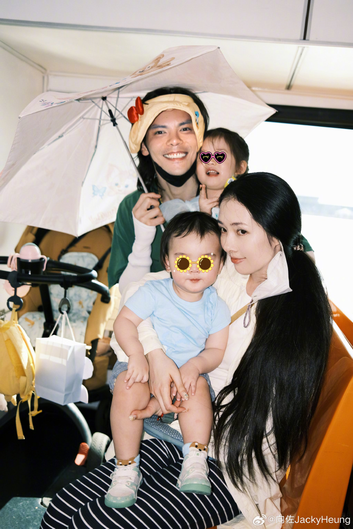8月1日,向佐晒出与郭碧婷带儿子女儿游迪士尼的照片,一家四口其乐融融,笑得很开心!