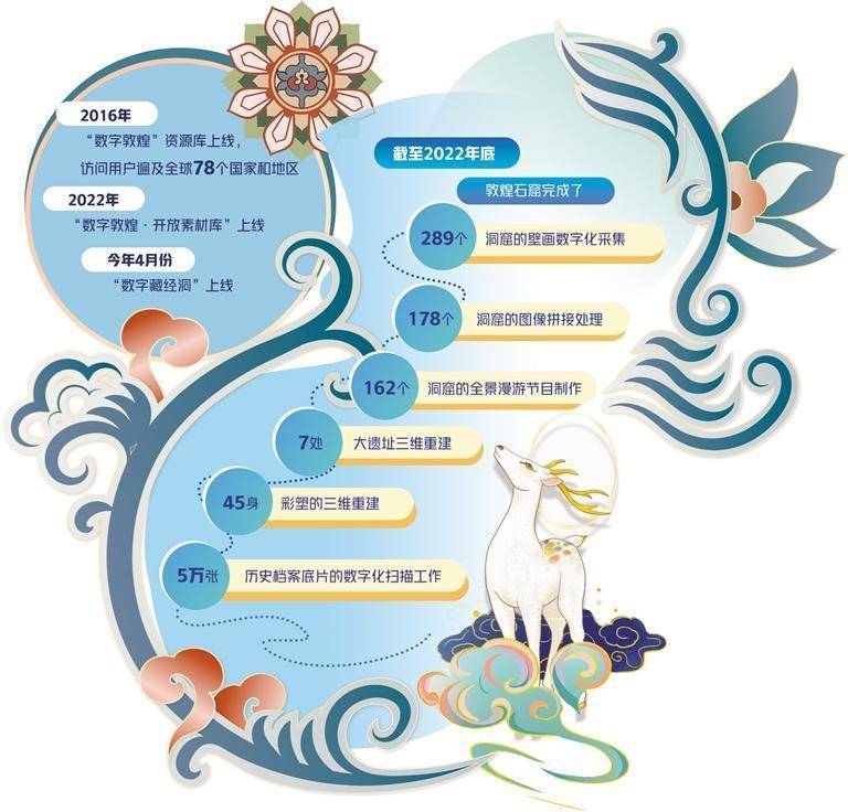 开放共享的网上平台,让全球用户共赏敦煌文化。自2016年“数字敦煌”资源库上线以来,先后实现了30个洞窟整窟高清图像和全景漫游节目全球共享,访问用户遍及全球78个国家和地区。2022年12月,敦煌研究院与腾讯公司联合打造的“数字敦煌·开放素材库”上线;今年4月份,结合敦煌学研究成果与游戏科技的“数字藏经洞”上线。敦煌之美通古今,一部手机游敦煌,就可以思接千载、视通万里。