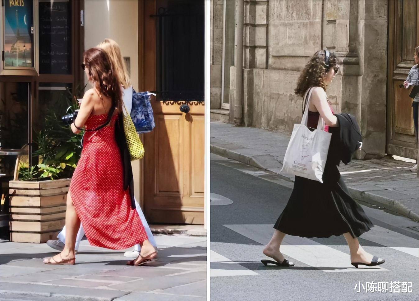 但他们选择凉鞋和拖鞋并非偶然。她们不会选择人字拖,而大多是系带凉鞋、穆勒鞋、小猫跟等,看起来弹力不大,却能增加时尚感。