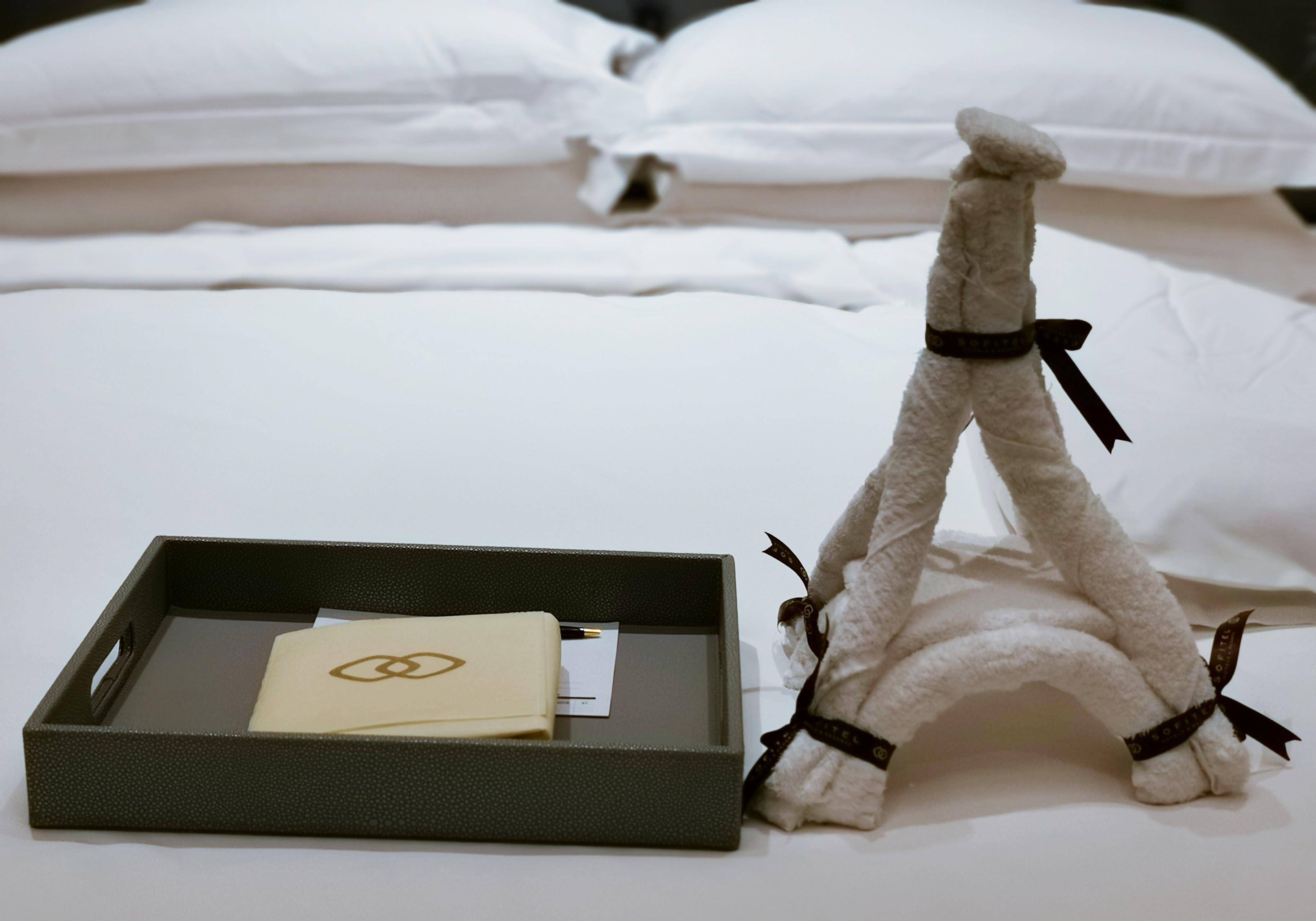 ▼这间索菲特酒店虽然房价不高,但是会员欢迎礼以及夜床服务却极其用心,每次来都有不同的花样,2018年是小动物,2019年则变成了一座埃菲尔铁塔。
