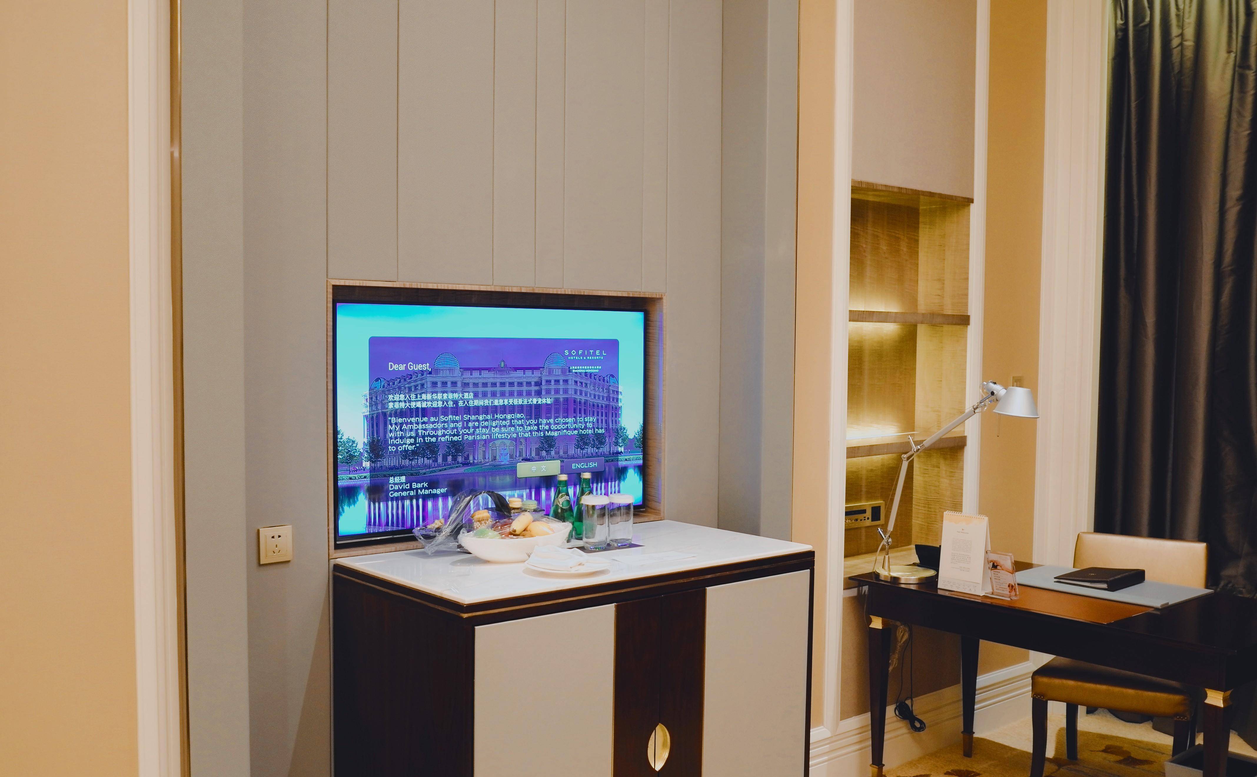 ▼由于建筑形式,新虹桥索菲特的顶层房间窗外有高而粗壮的石栏,非常影响采光,这一点在《完美关系》剧中也体现了出来。而这间房间的楼层刚好既是高层又不在顶楼,一进门就可感觉到通透,大面积的窗户可以轻松观赏酒店周边郁郁葱葱的景色。