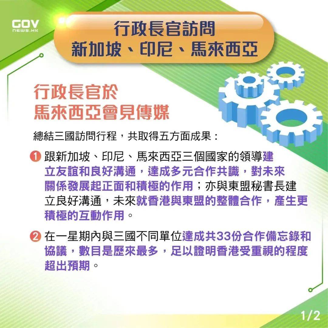 1.和三国领导达成多元合作共识,对未来关系发展起正面和积极作用。他也和东盟秘书长建立良好沟通,未来就香港和东盟的整体合作产生更积极互动作用。