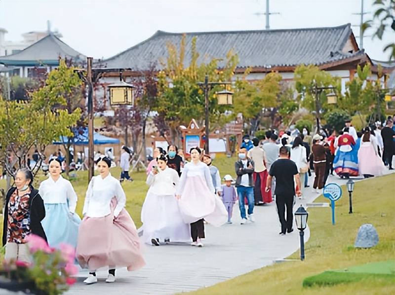 不远处的中国朝鲜族民俗园里,青砖白瓦的亭台楼榭间,身着朝鲜族民族服饰的游客往来穿梭,热闹非凡。中国朝鲜族民俗园以“旅游+民俗+体验”的形式,将民俗风情展示、文化演艺体验、特色餐饮民宿、古朴传统建筑等相互融合,成为游客感受朝鲜族民俗文化的重要打卡地。