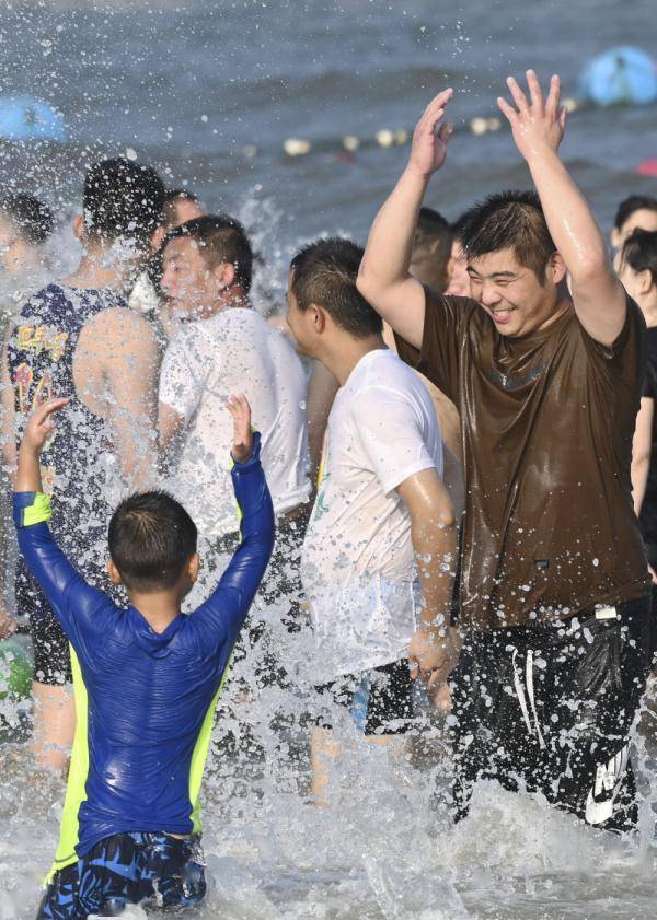 ↑8月2日,游客在秦皇岛市北戴河区东山浴场戏水。 新华社记者 杨世尧 摄