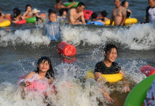 ↑8月2日,游客在秦皇岛市北戴河区东山浴场戏水新华社记者 杨世尧 摄