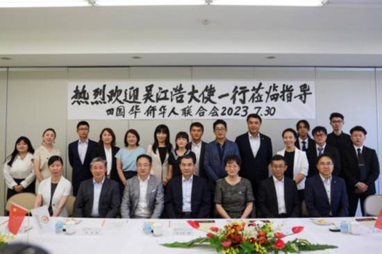 当天上午,吴江浩一行同四国华侨华人联合会会长张嘉树及华侨华人代表座谈。吴江浩表示,华侨华人是祖国发展建设的重要力量,党和国家始终高度关心广大侨胞工作生活情况。中日友好根基在民间,希望四国地区华侨华人心怀祖国、融入当地,为两国民间友好关系发展搭建更多桥梁。