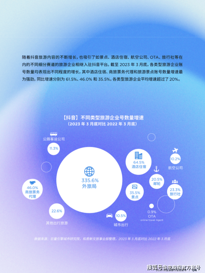《2023抖音旅游行业白皮书》显示,截至今年 3 月底,抖音上景点、酒店住宿、航空公司、OTA、旅行社等各类旅游企业账号数量的平均增速超过了 20%,其中酒店住宿、商旅票务的账号数量的增速高达 61.5%、46.0%。