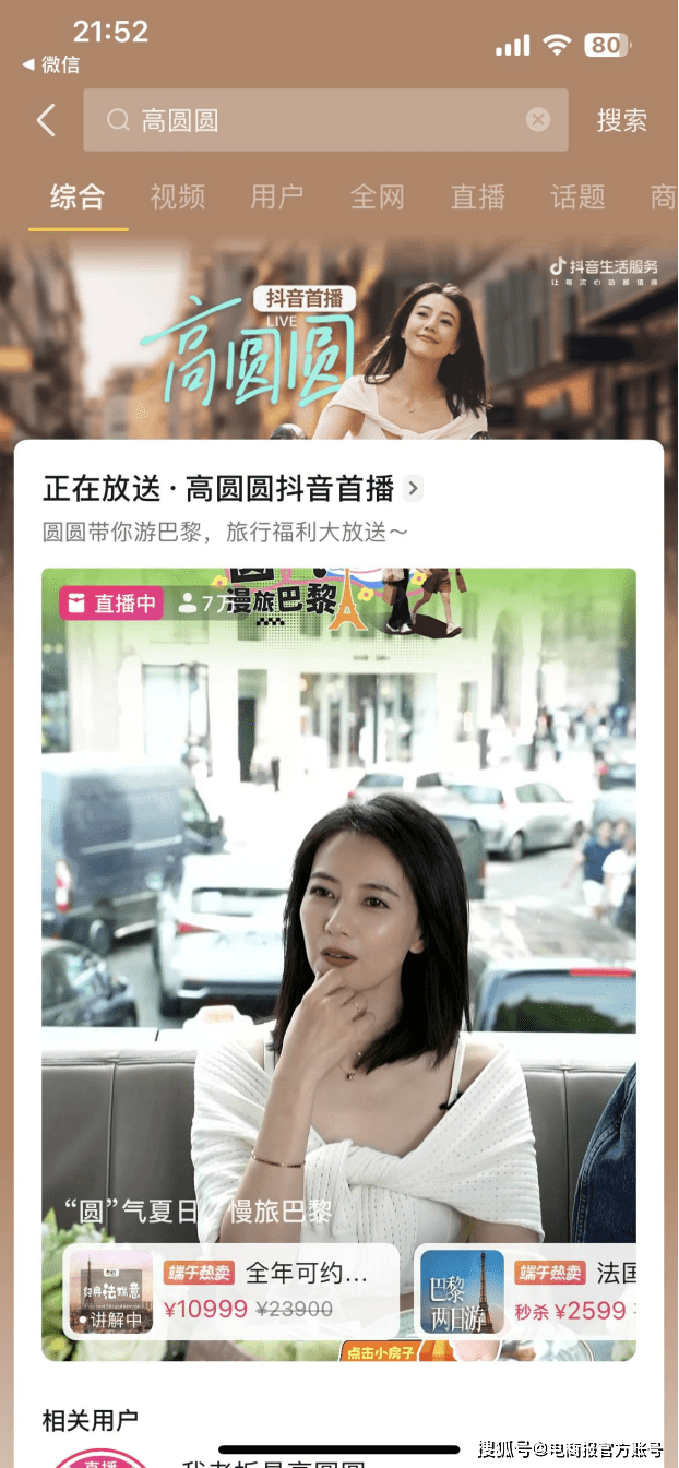 比如6月份时,高圆圆在抖音进行了在线同游巴黎直播,直播间上架了法国意大利瑞士直飞11天9晚、高奢法意瑞11天游等旅游产品,客单价高达9000元;黄圣依夫妇也直播卖迪士尼乐园门票、北京五天四晚游等旅游产品,单场GMV超过了1.5亿元。