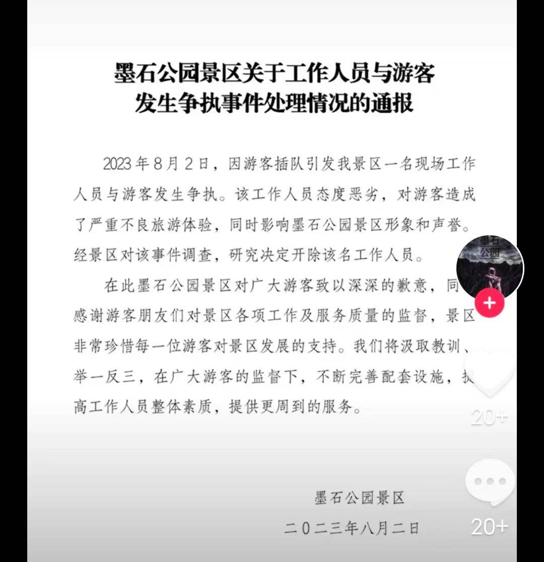8月3日,红星新闻记者了解到,此事处理结果已经出炉。2日晚,墨石公园景区发布“关于工作人员与游客发生争执事件处理情况的通报”。通报称,2023年8月2日,因游客插队引发墨石公园景区一名现场工作人员与游客发生争执。该工作人员态度恶劣,对游客造成了严重不良旅游体验,同时影响墨石公园景区形象和声誉。经景区对该事件调查,研究决定开除该名工作人员。