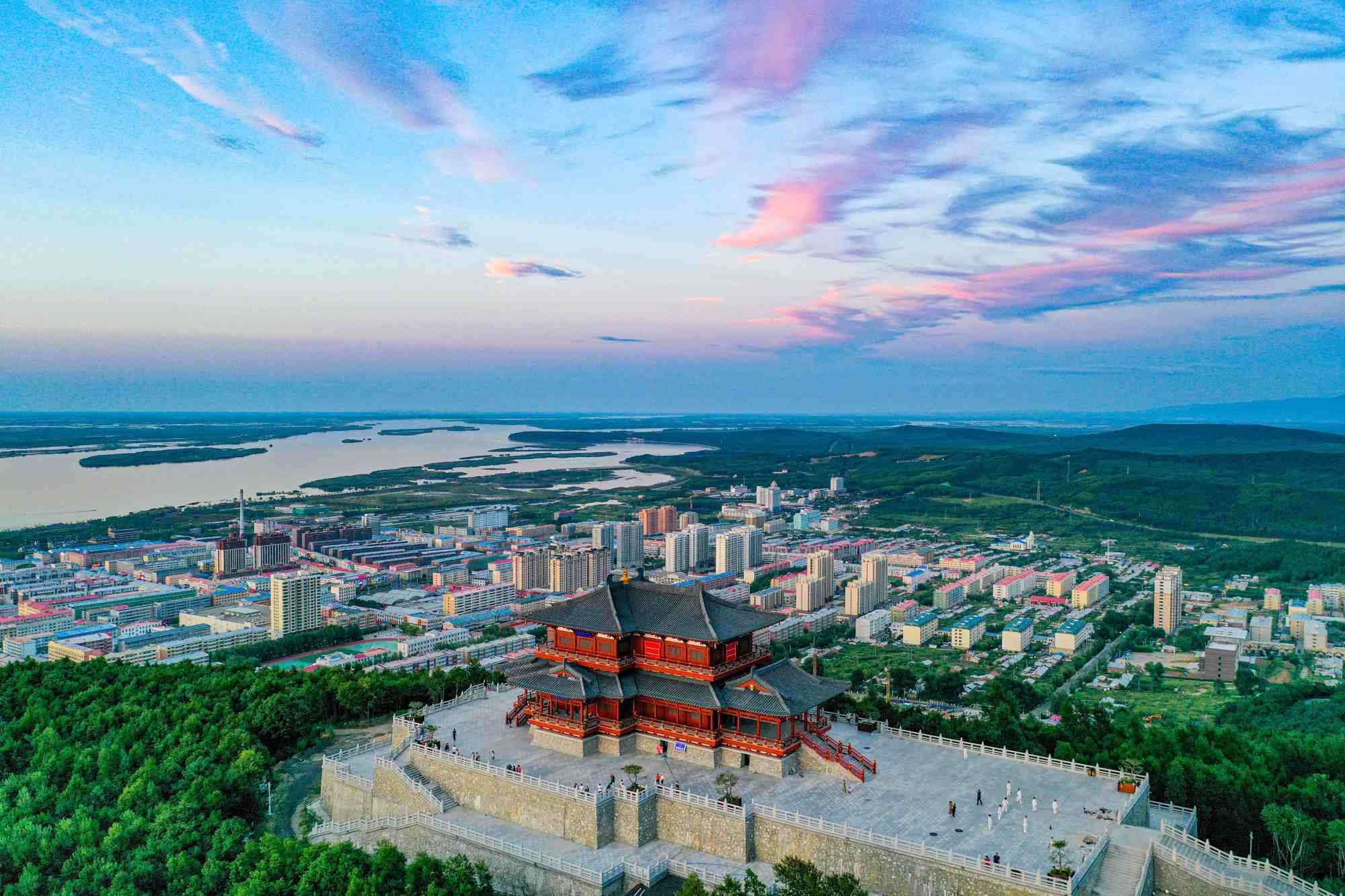 作为城市至高点标志性建筑,登顶东极阁可鸟瞰整个抚远城,将城、江、林、河、田等景色尽收眼底。连绵的山体犹如一只大鹏鸟展翅俯卧在绿色的山川和黑龙江畔。