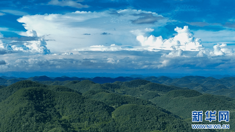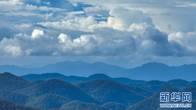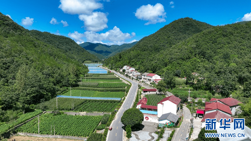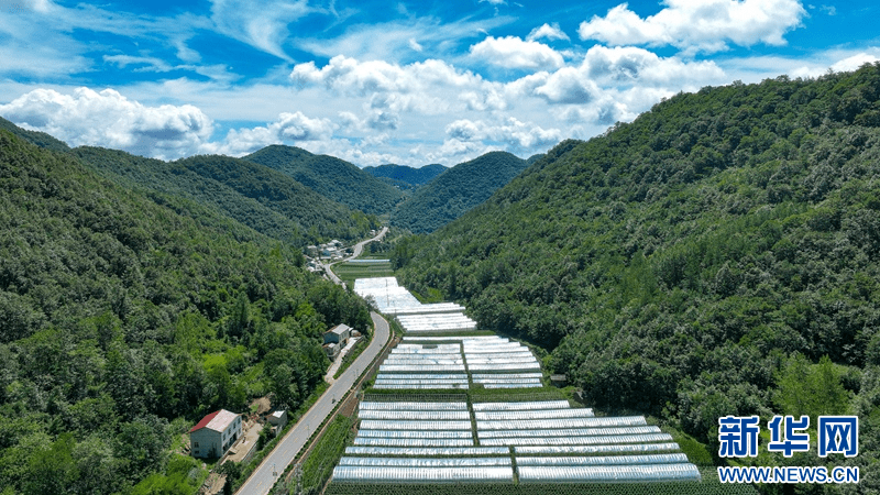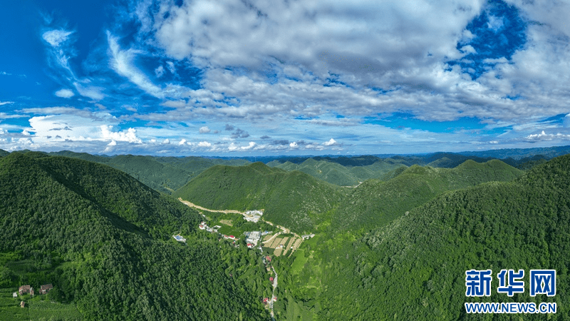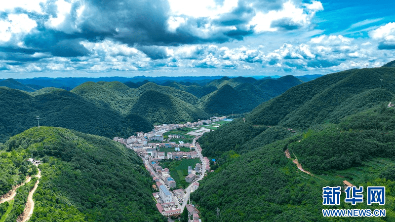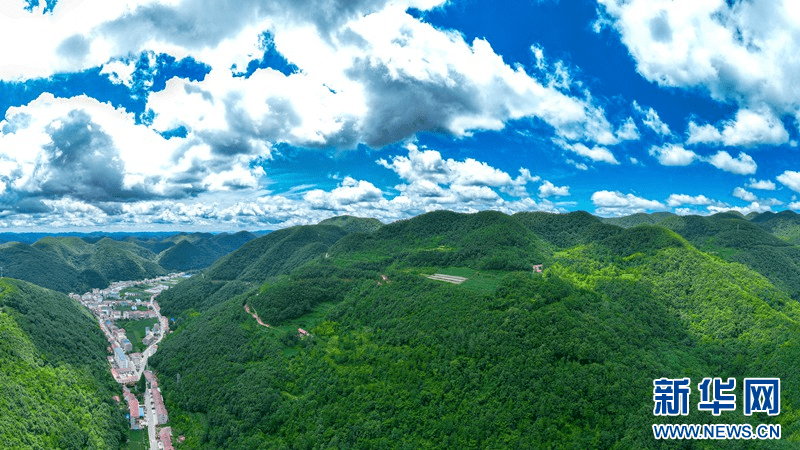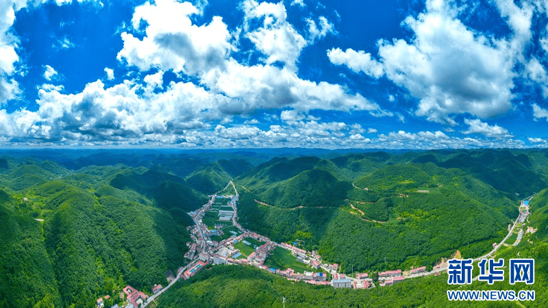 盛夏时节,在湖北省襄阳市保康县荆山主峰聚龙山腹地龙坪镇,群山和集镇在蓝天白云的映衬下构成美丽画卷。